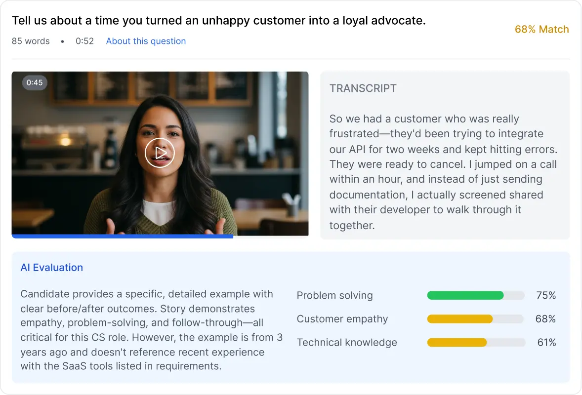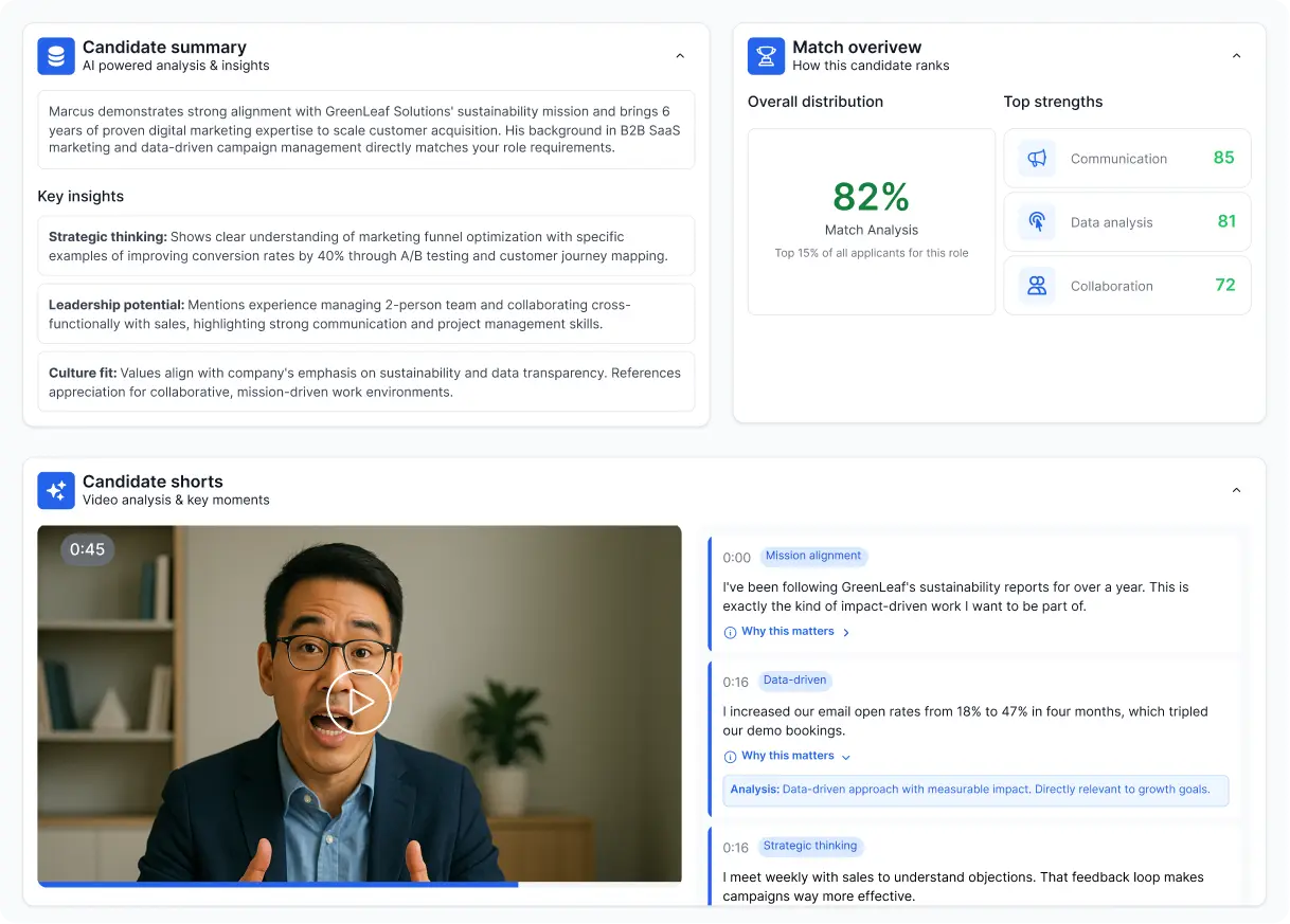 You can certainly watch the candidate videos in full! However, our AI helps streamline the process by providing summaries, insights, and highlights based on the responses.