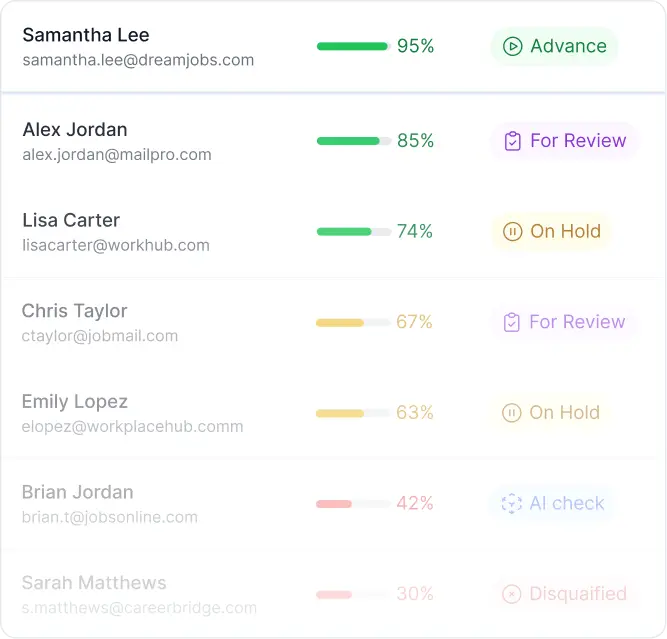 AI-powered applicant screening software that shows you who to interview before you waste time on the wrong people. Built for lean teams who need to hire fast without sacrificing quality.