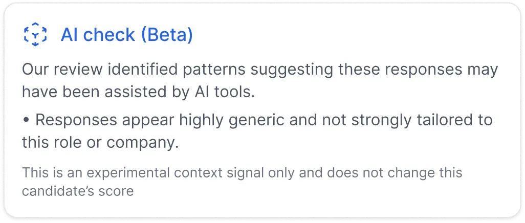 Built-in signal that highlights when answers show patterns of AI assistance. A context flag—not a judgment—so you can review more carefully. Fair, transparent, and human-in-the-loop by design.