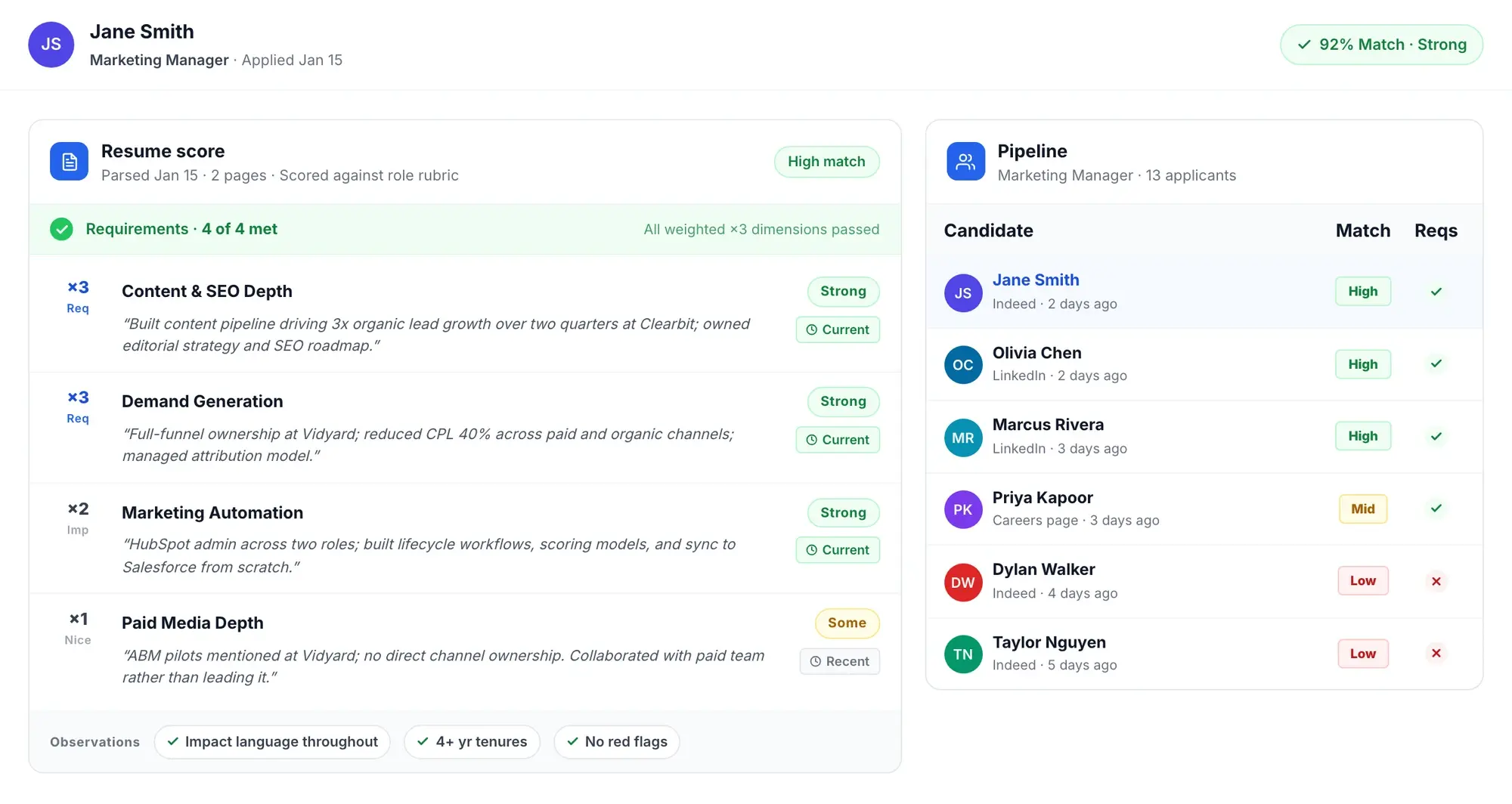 An applicant tracking system manages job postings, applications, pipelines, and offers. Candidate screening software focuses on the evaluation layer — giving your team structured, comparable information about each candidate before live conversations. Think of your ATS as pipeline management and screening software as the decision-support layer.