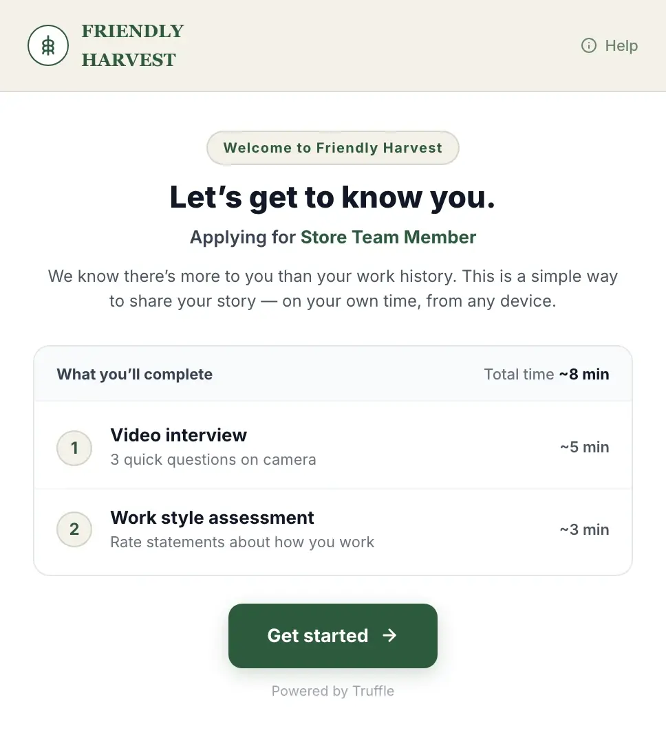 Truffle supports four core screening methods: one-way video interviews, automated resume screening (in beta), structured talent assessments (Personality, Situational Judgment, and Environment Fit), and text-based qualification checks. You can use any single method on its own or combine them for each role. Most teams start with async interviews and add assessments or resume screening as they grow.