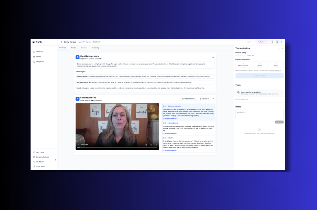 Look for software that is easy for your team to launch and easy for candidates to complete. Candidate experience matters just as much as recruiter convenience. Video interview software like Truffle keeps set-up simple with a one-link workflow, no training requirement, and built-in AI features that help teams review faster.