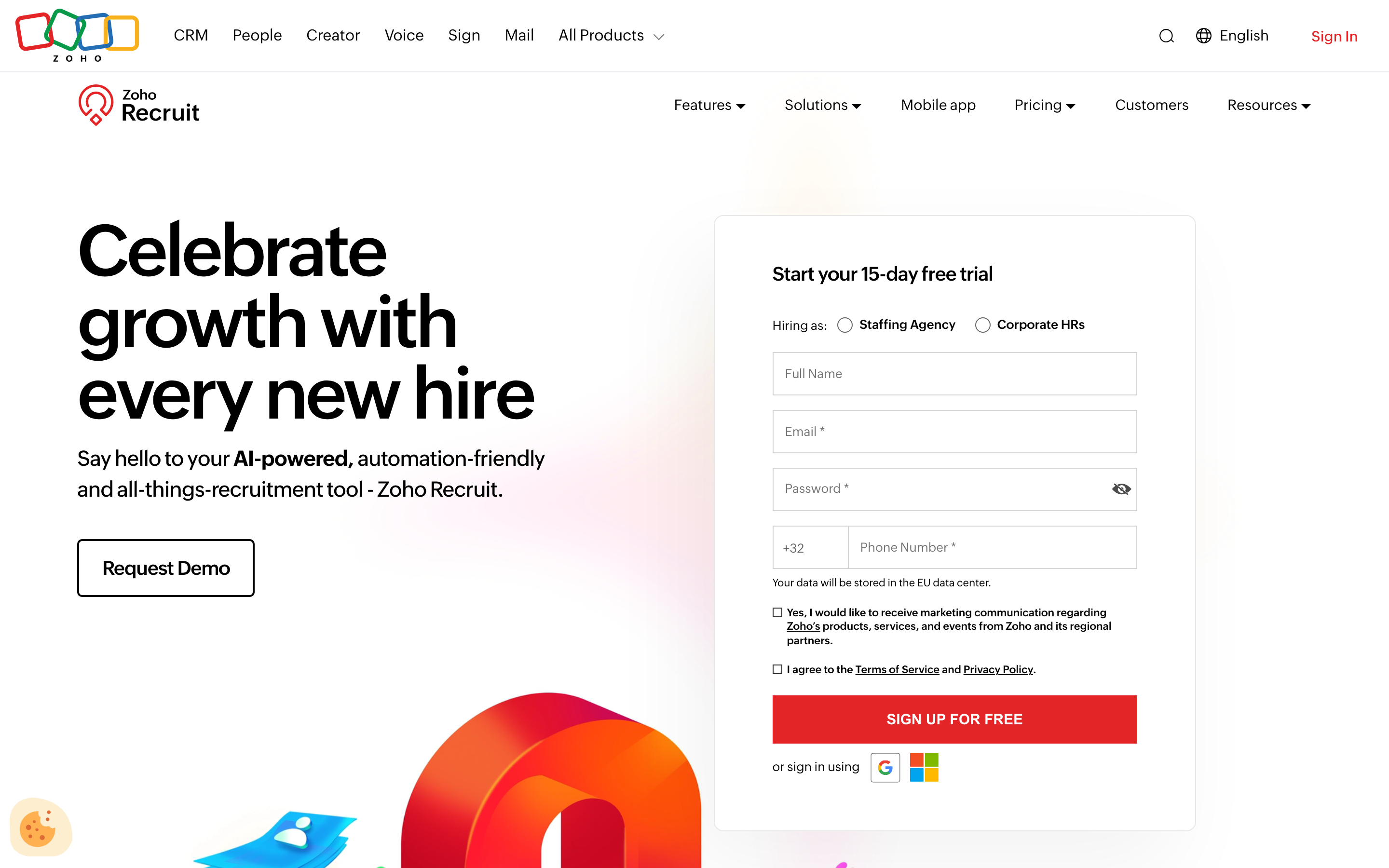 Zoho Recruit is the staffing arm of the broader Zoho suite, and it's priced aggressively for small teams. Positioning: the budget-friendly staffing CRM for solo recruiters and small agencies.