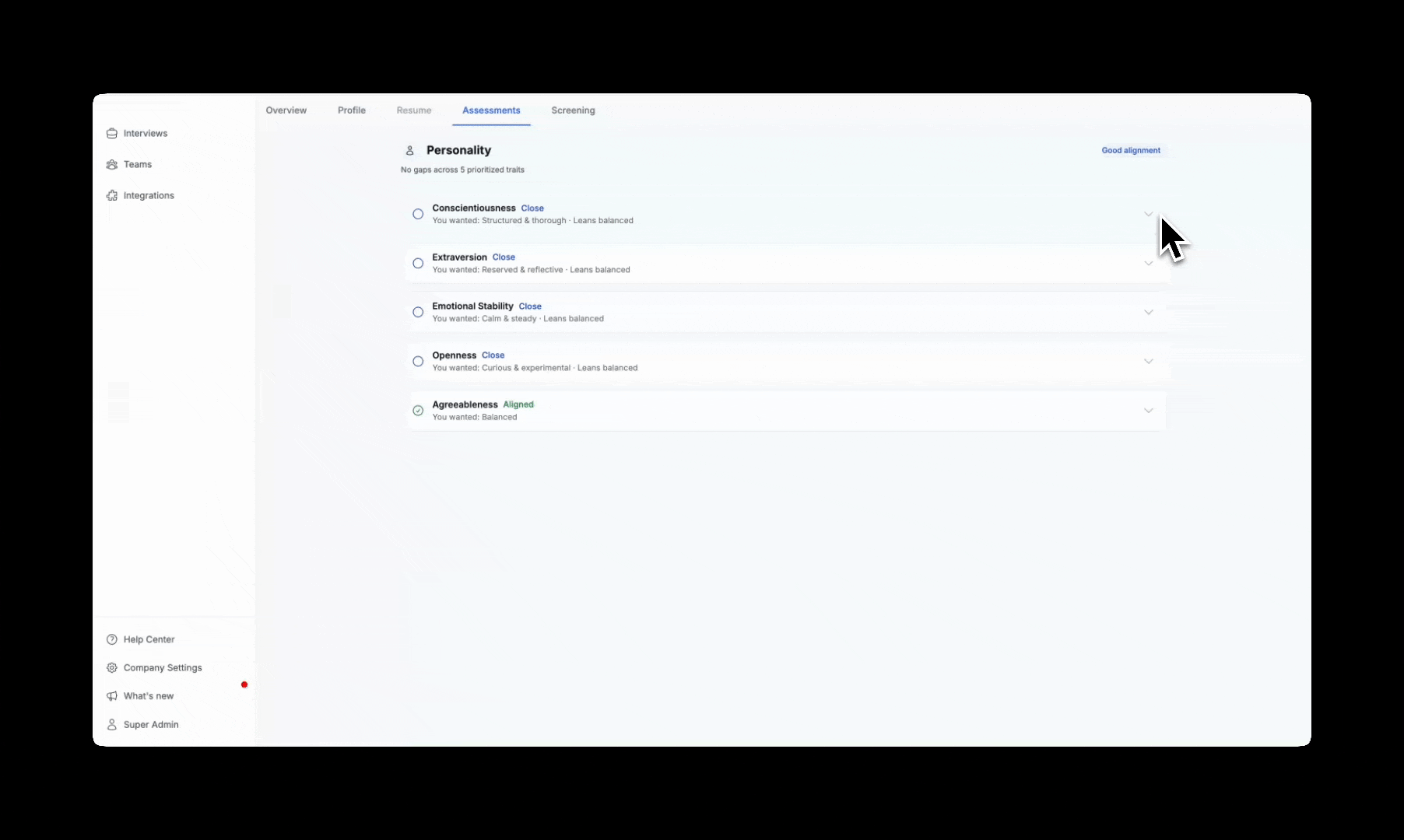 - Environment Fit assessments that surface whether a candidate's preferences (remote vs. in-office, fast-paced vs. methodical) match the actual reality of the role.