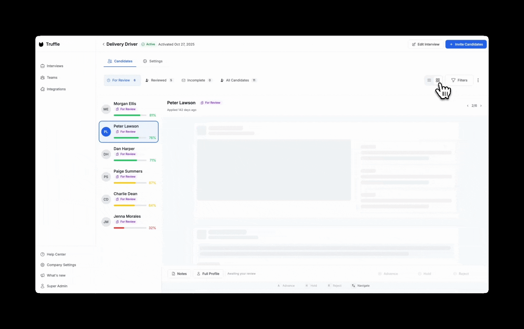 You choose which layers to use. Resumes and assessments for a high-volume hourly role. All three for a senior hire. Just interviews for a role where communication is the deciding factor. Truffle doesn't force a sequence. You design the process.