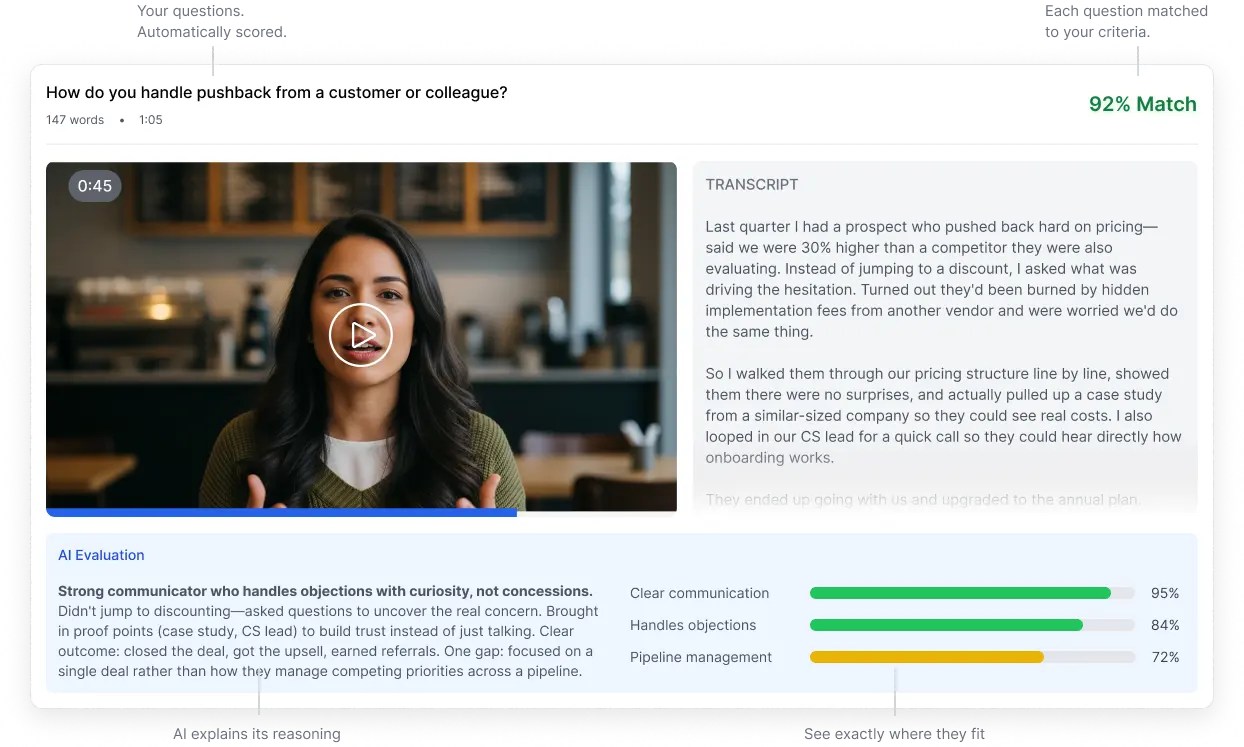 When it’s a better fit than Vervoe: You’re screening for communication, clarity, and role alignment in the first round. You want one-way interviews plus AI that helps you prioritize reviews, not a large test library.