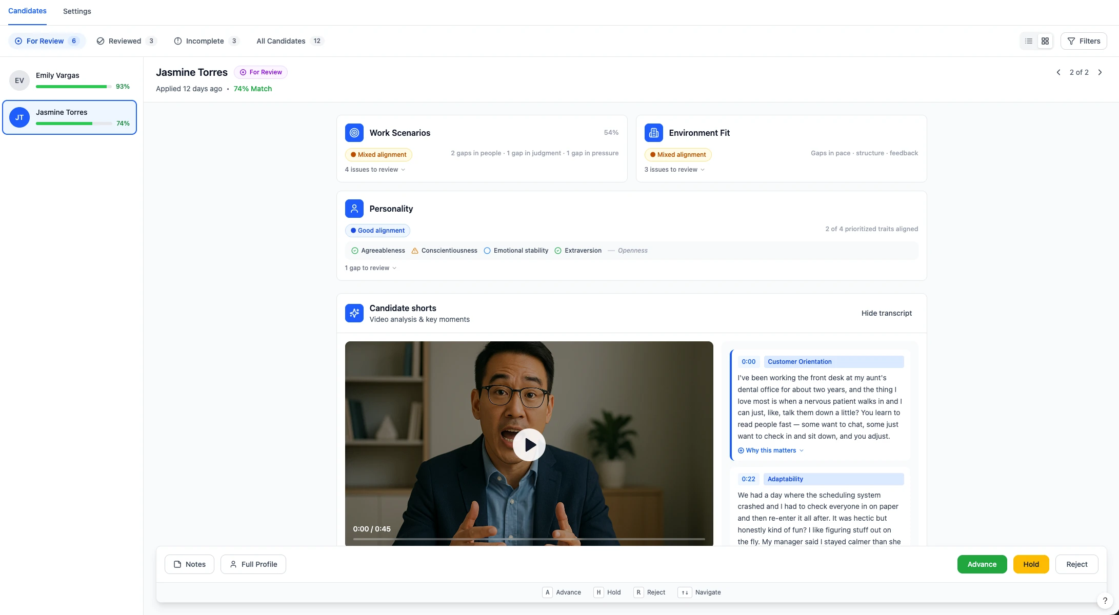 Truffle is a candidate screening platform that combines resume screening, one-way video interviews, and talent assessments. AI transcribes and scores every response against your criteria, surfaces match scores, generates summaries, and creates 30-second Candidate Shorts. You review the evidence. You make the call.