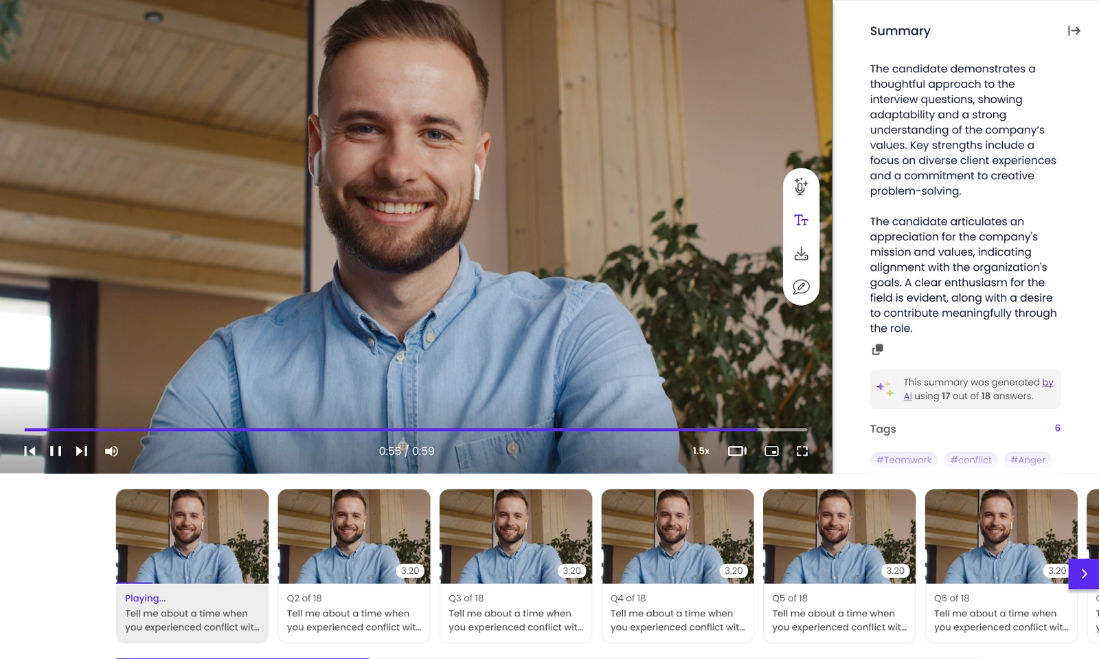 The low price reflects a narrower feature set. You get recorded video responses, but no AI transcription, no scoring, and no candidate summaries. If your workflow relies on manually watching every recording, Hireflix keeps costs down. If you want AI to surface the strongest candidates, you'll need a different platform.