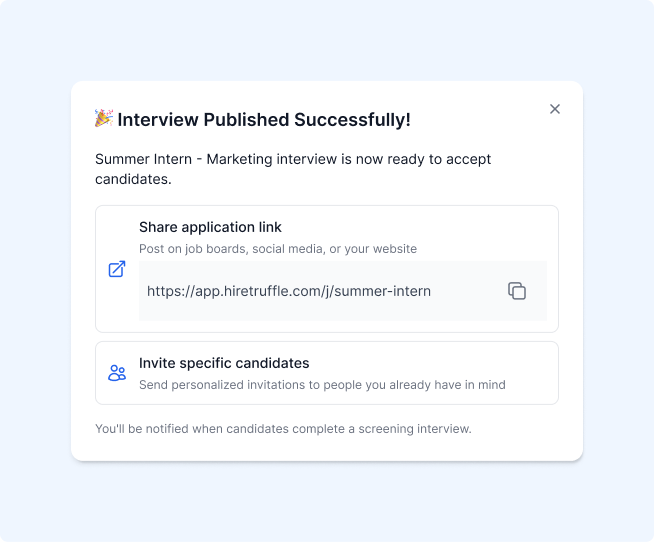 Paste your job description, add questions that reveal communication skills and motivation, and generate a shareable link. Send it to everyone who applies, post it at career fairs, or embed it in your campus recruiting emails. Five minutes to set up, then let candidates come to you.