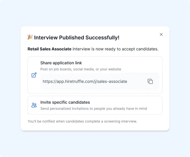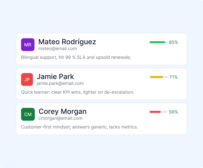Truffle's AI reads your job description, understands your criteria, and evaluates every candidate response. You get match percentages, per-question breakdowns, and clear reasoning—not a pile of unwatched videos.